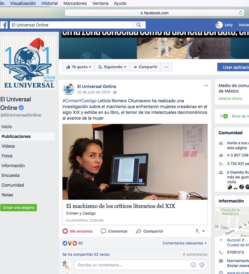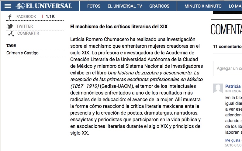 Bajo el título «El machismo de los críticos literarios del XIX», se publicó ayer en el diario El Universal una breve reseña sobre el libro Una historia de zozobra y desconcierto. La recepción de las primeras escritoras profesionales en México (1867-1910). Aquí puede revisarse: