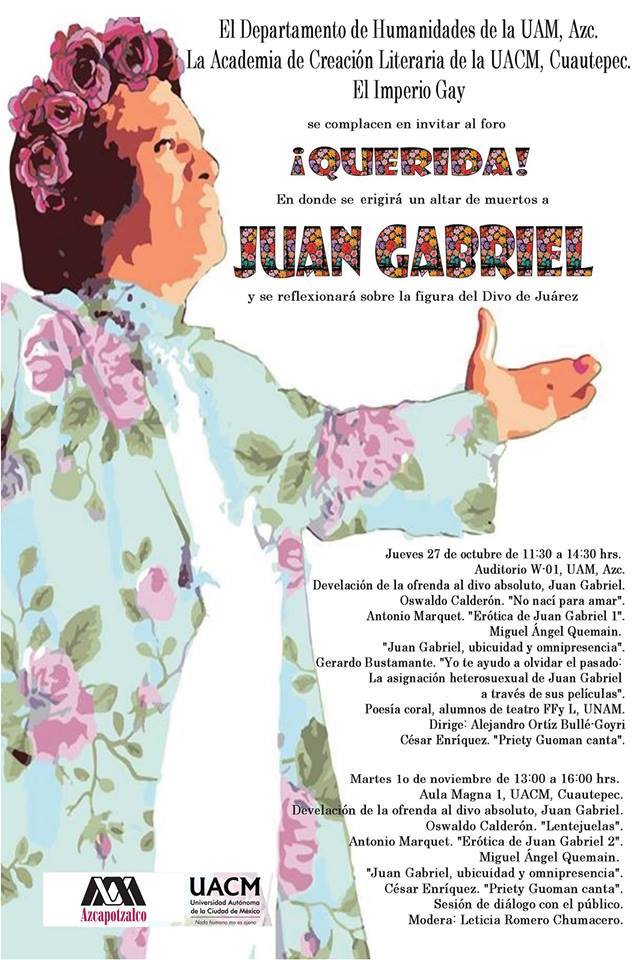 El martes 1 de noviembre, en la UACM-Cuautepec, se llevará a cabo el foro «¡Querida!» y la develación de una ofrenda de Día de Muertos dedicada a la memoria de Juan Gabriel, el Divo de Juárez y de México todo.
