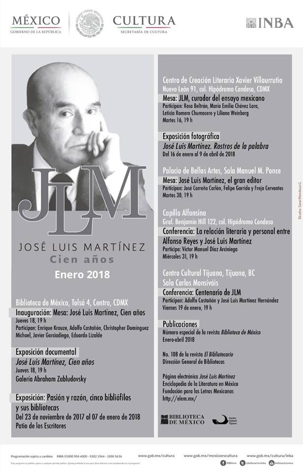 El Centro de Creación Literaria Xavier Villaurrutia anuncia la tertulia dedicada al maestro José Luis Martínez, en el centenario de su nacimiento. «En esta tertulia se abordará desde diversas perspectivas críticas la incomparable y extraordinaria labor de José Luis Martínez como historiador del ensayo mexicano moderno».