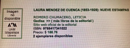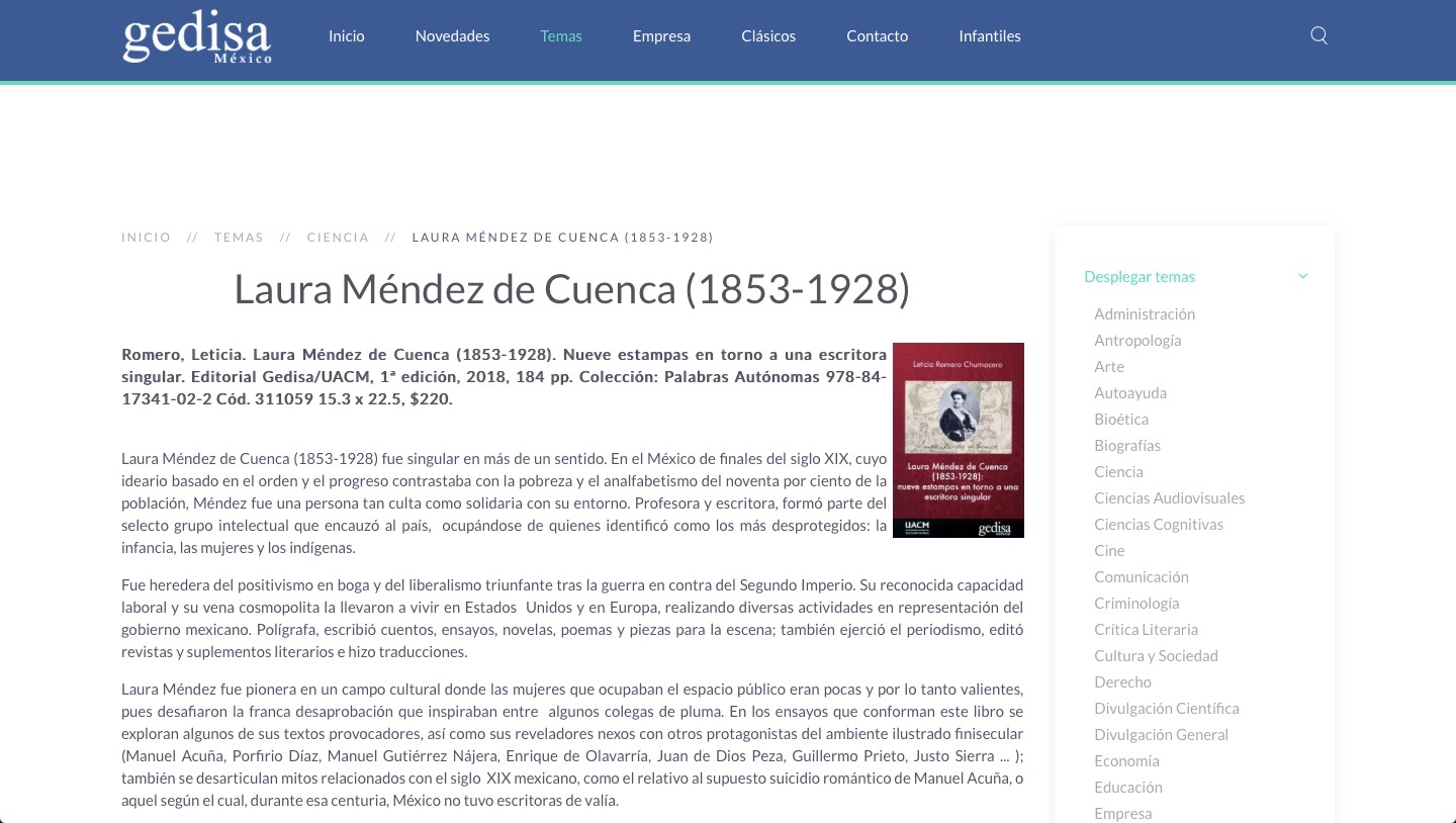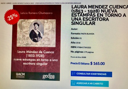 La editorial Gedisa ya reporta el libro Laura Méndez de Cuenca (1853-1928). Nueve estampas en torno a una escritora singular, como una de sus novedades: