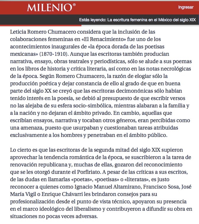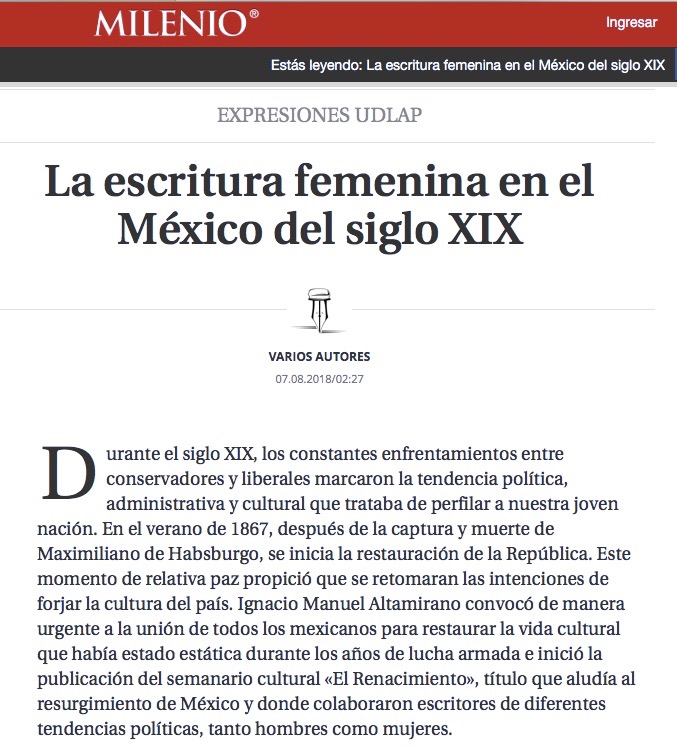 En nota publicada en el diario Milenio, dentro de la sección «Expresiones UDLAP», editada por la Universidad de las Américas Puebla, se cita generosamente el trabajo de la Dra. Leticia Romero Chumacero en relación con las condiciones de posibilidad de la escritura de mujeres durante el último cuarto del siglo XIX. Esto se agradece. Aquí está el artículo íntegro: