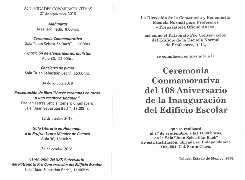 Ceremonia conmemorativa del 108 aniversario del Edificio Escolar de la Escuela Normal de Profesores del Estado de México y presentación del libro «Laura Méndez de Cuenca»