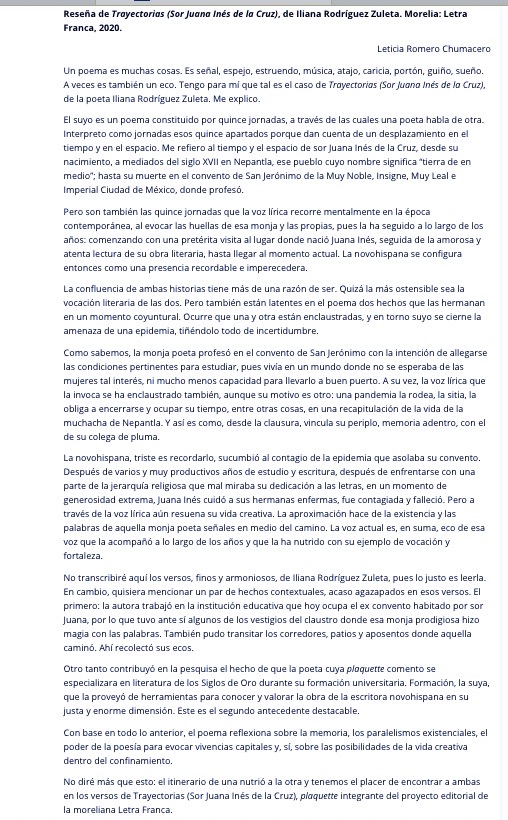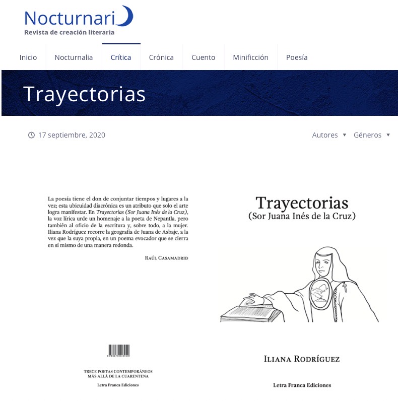 Nocturnario. Revista de creación literaria, publicó en su número 30 (julio-septiembre, 2020) una reseña de la plaquette Trayectorias (Sor Juana Inés de la Cruz), de la poeta y catedrática Iliana Rodríguez Zuleta. Aquí está la liga: