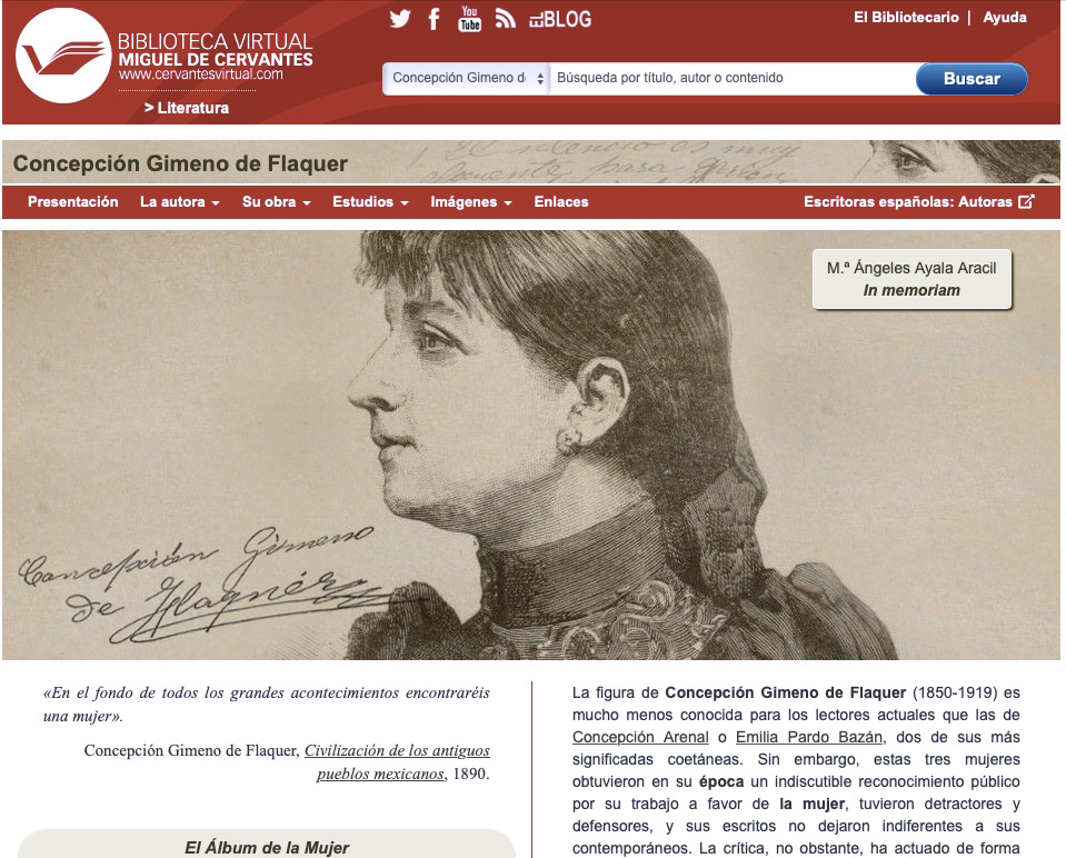 En 2020, la Biblioteca Virtual Miguel de Cervantes seleccionó el artículo «Concepción Gimeno, Emilia Serrano y las escritoras mexicanas durante el siglo XIX» para incluirlo en el portal dedicado a Concepción Gimeno de Flaquer. Se trata de un artículo publicado originalmente en la revista Mitologías hoy, de la Universidad Autónoma de Barcelona.