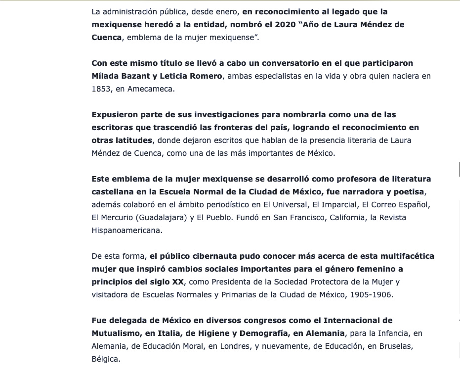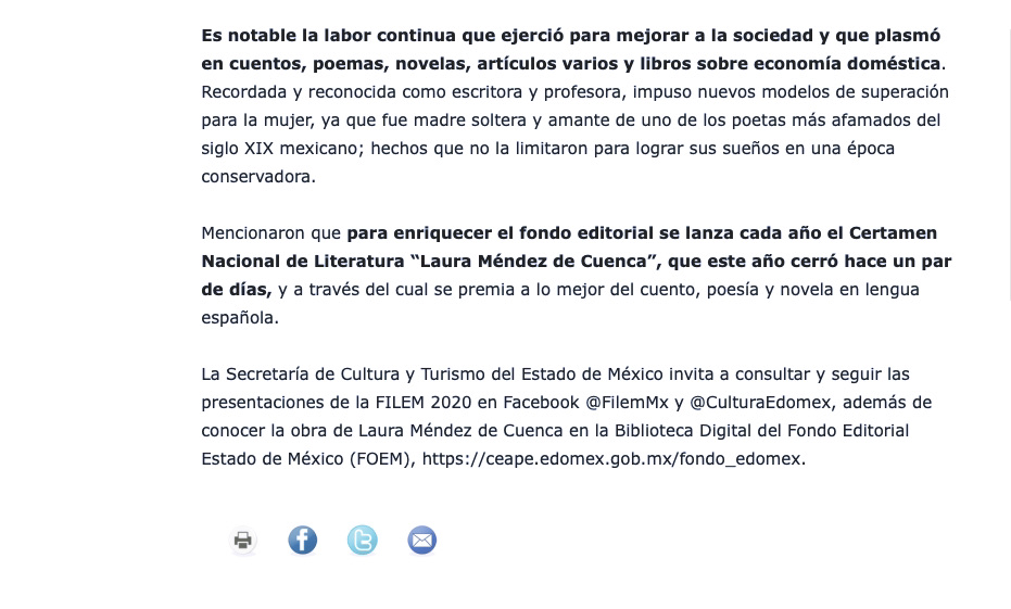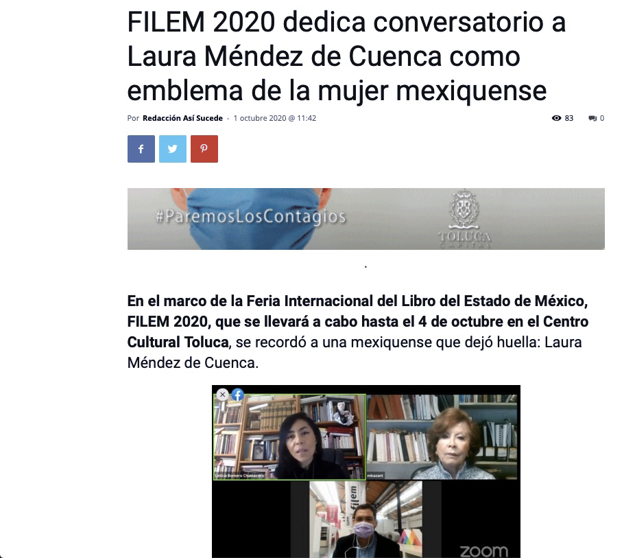 Recuento anual-2020-Octubre Notas periodísticas sobre el homenaje a Laura Méndez de Cuenca, en la Feria Internacional del Libro del Estado de México