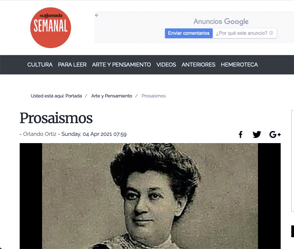 Mención en la columna “Prosaismos: Laura la de Acuña (I de II)”, de Orlando Ortiz, en el suplemento “La Jornada Semanal”, del periódico La Jornada (4 de abril de 2021).