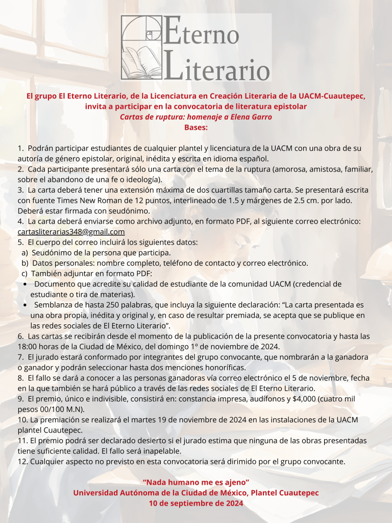 El colectivo estudiantil El Eterno Literario, coordinado por la doctora Leticia Romero Chumacero en el Plantel Cuautepec de la UACM, convoca al premio Cartas de ruptura: Homenaje a Elena Garro. Se recibirán epístolas hasta el 1 de noviembre de 2024.