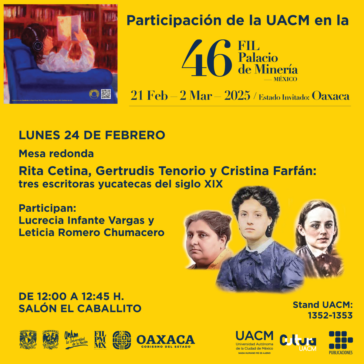 • 30 de noviembre de 2025: Presentación de «Rita Cetina, Gertrudis Tenorio y Cristina Farfán» en la Feria Internacional del Libro de Guadalajara 29 noviembre, 2025