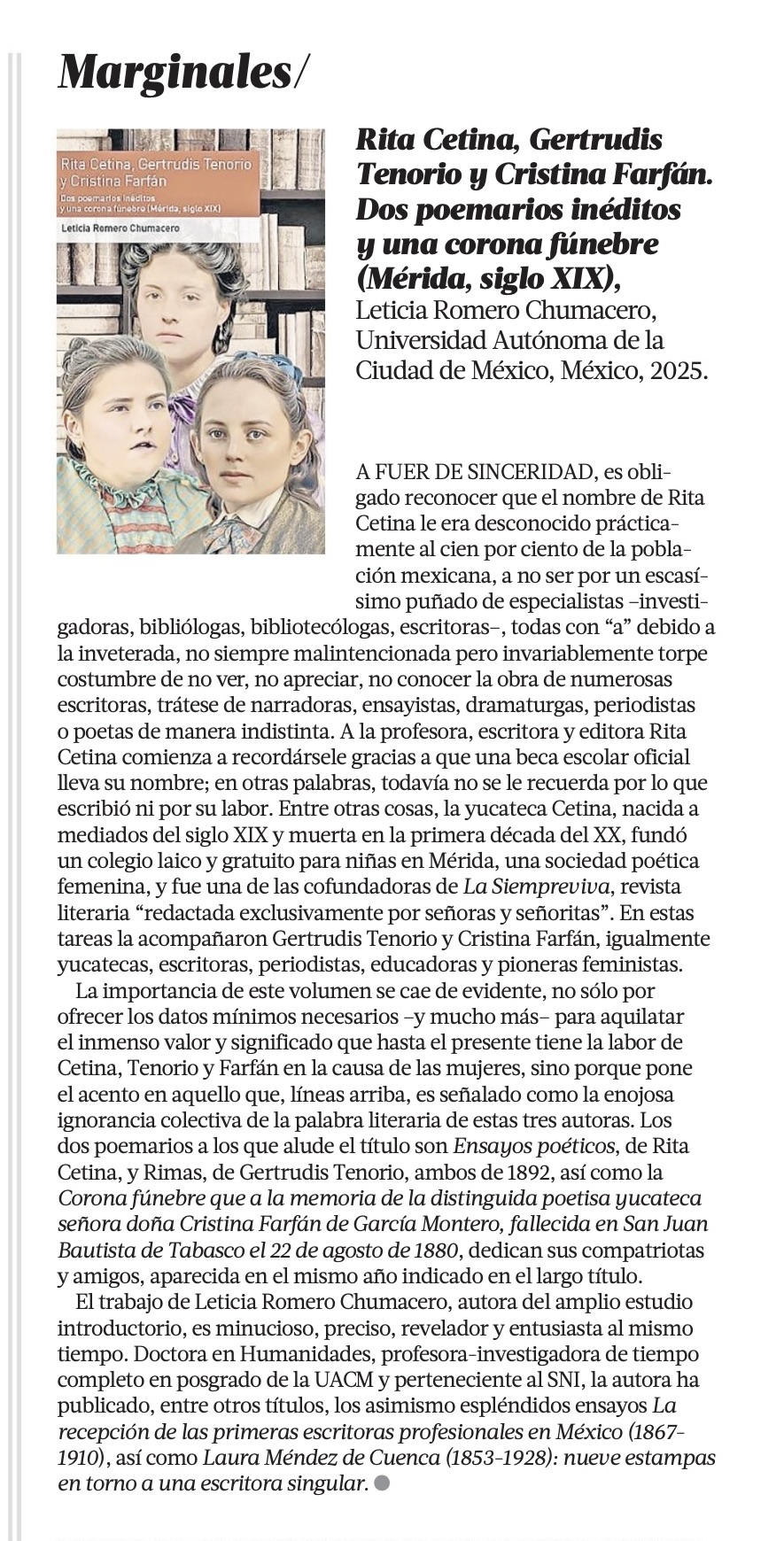 15 de marzo de 2026: Reseña del libro «Rita Cetina, Gertrudis Tenorio y Cristina Farfán…» en el diario «La Jornada»