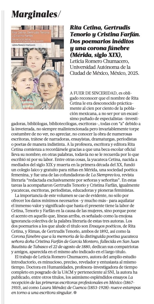 • 15 de marzo de 2026: Reseña del libro «Rita Cetina, Gertrudis Tenorio y Cristina Farfán…» en el diario «La Jornada» 15 marzo, 2026
